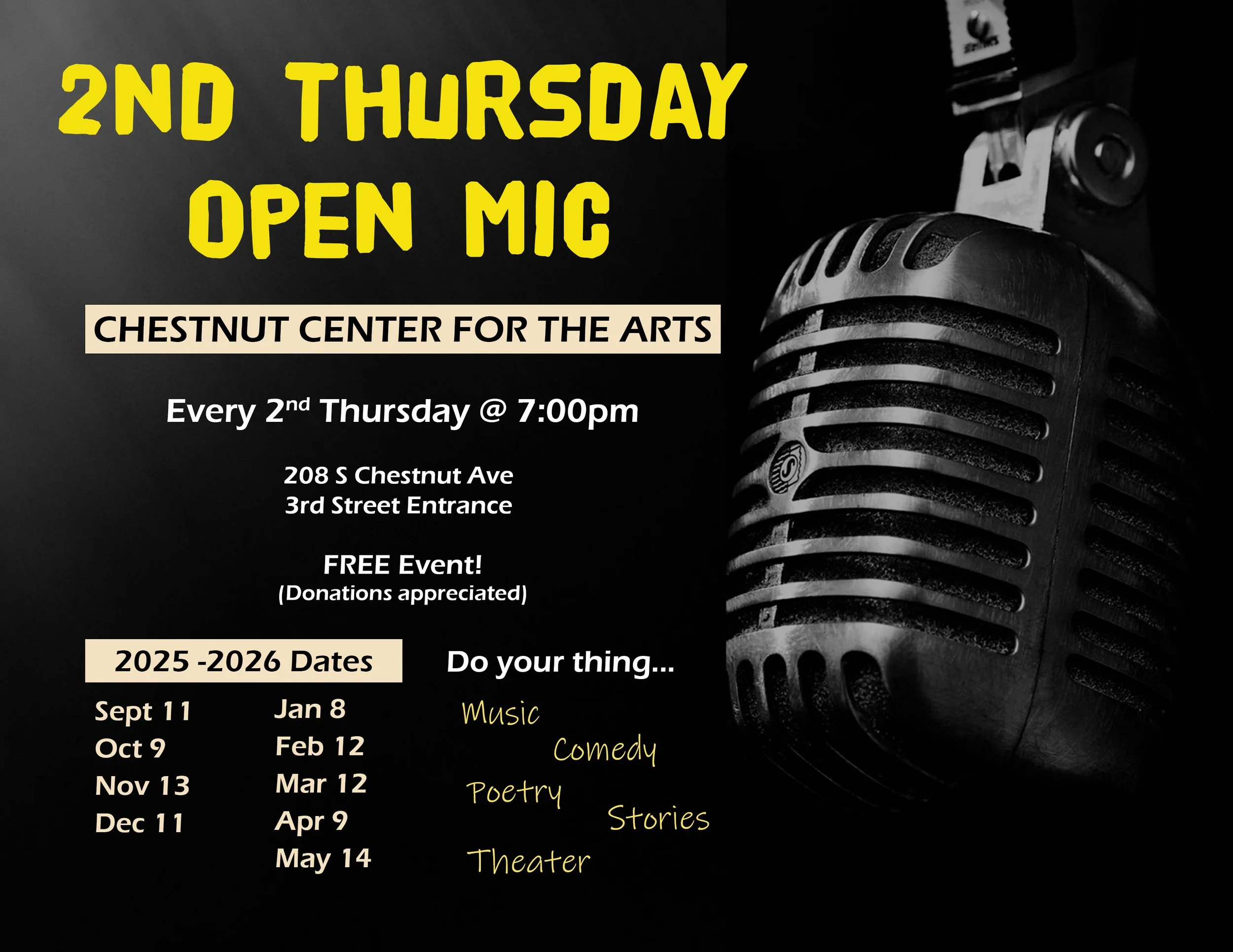 Join us at the Chestnut Center for the Arts for our monthly 2nd Thursday open mic event series!